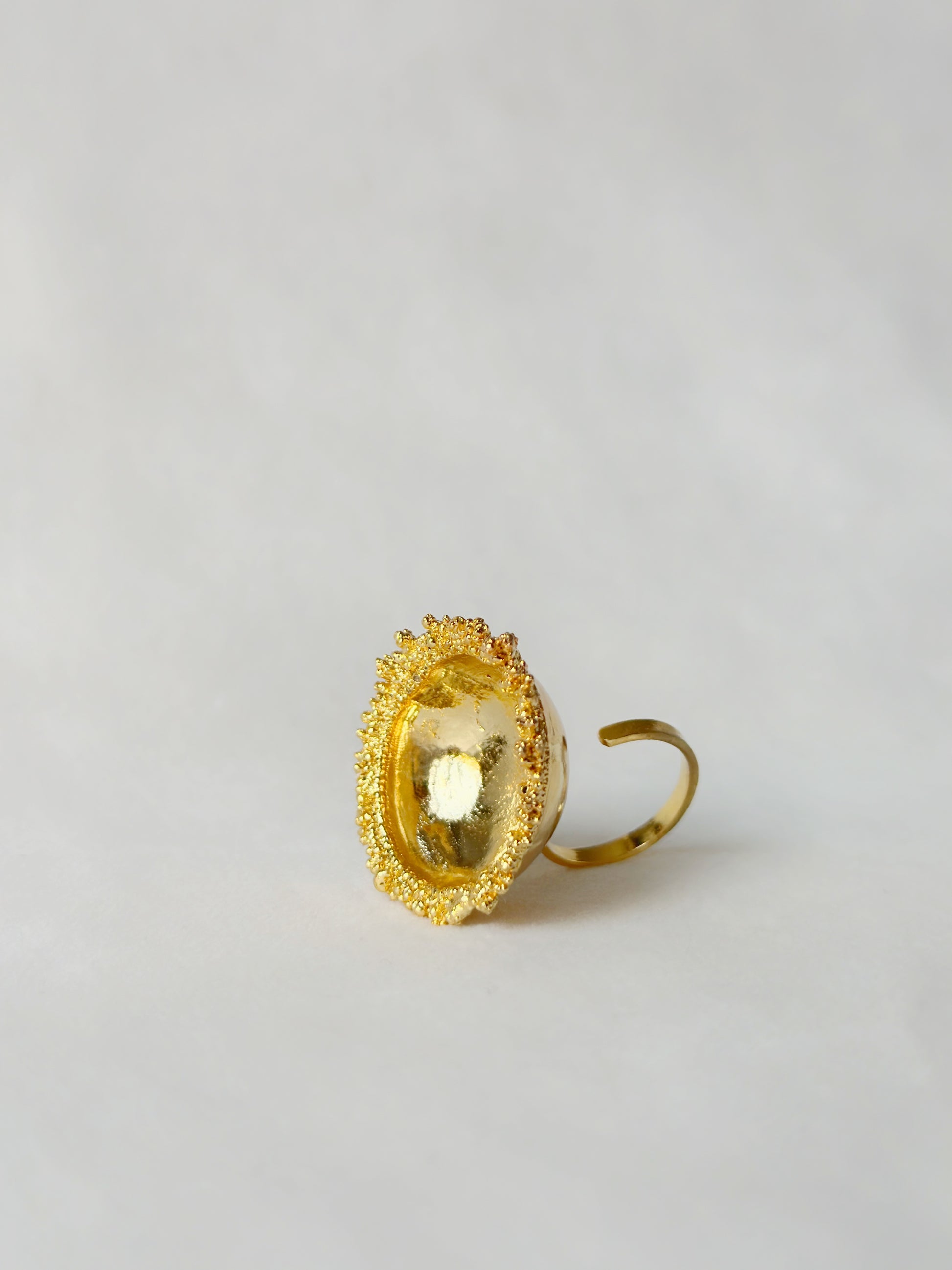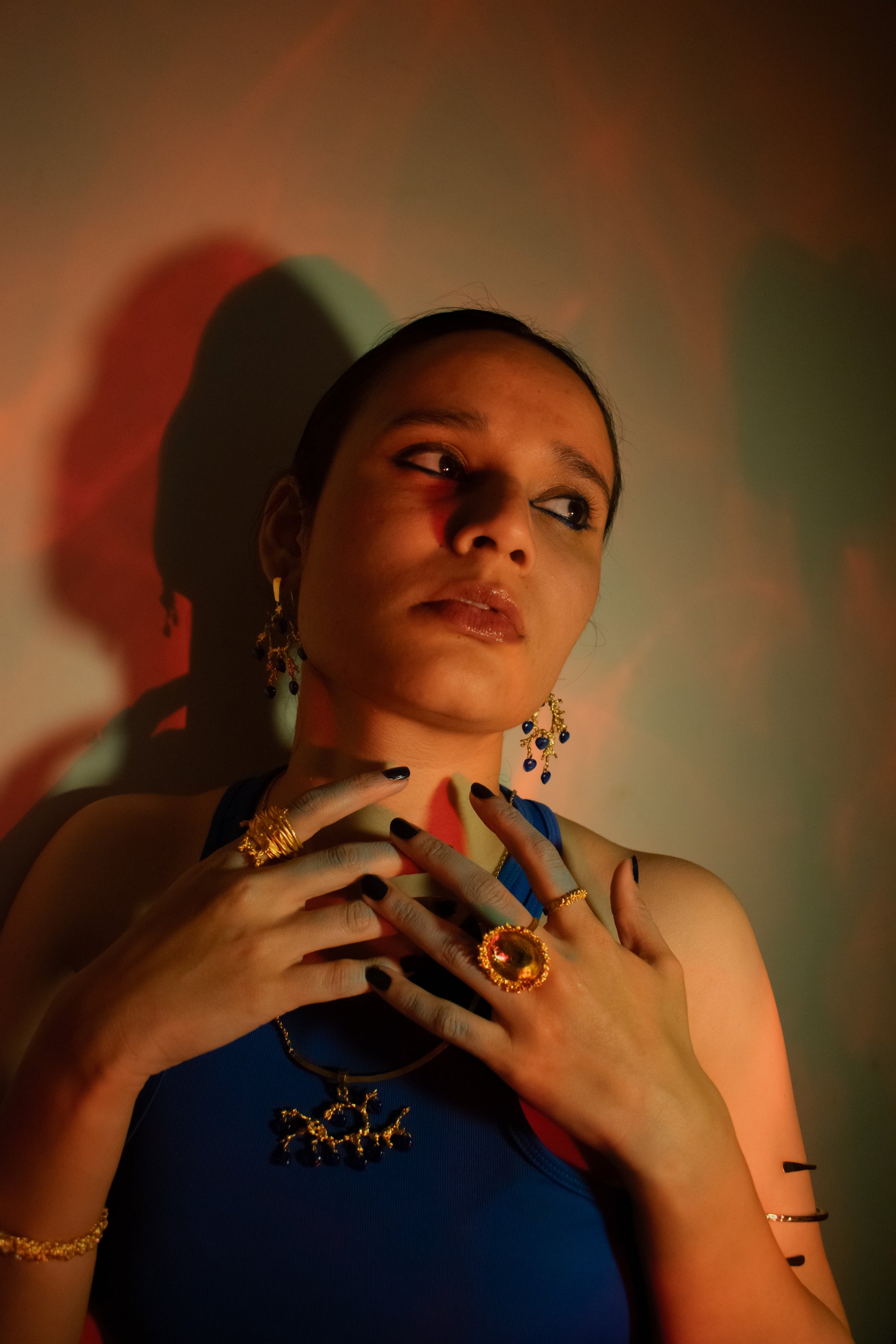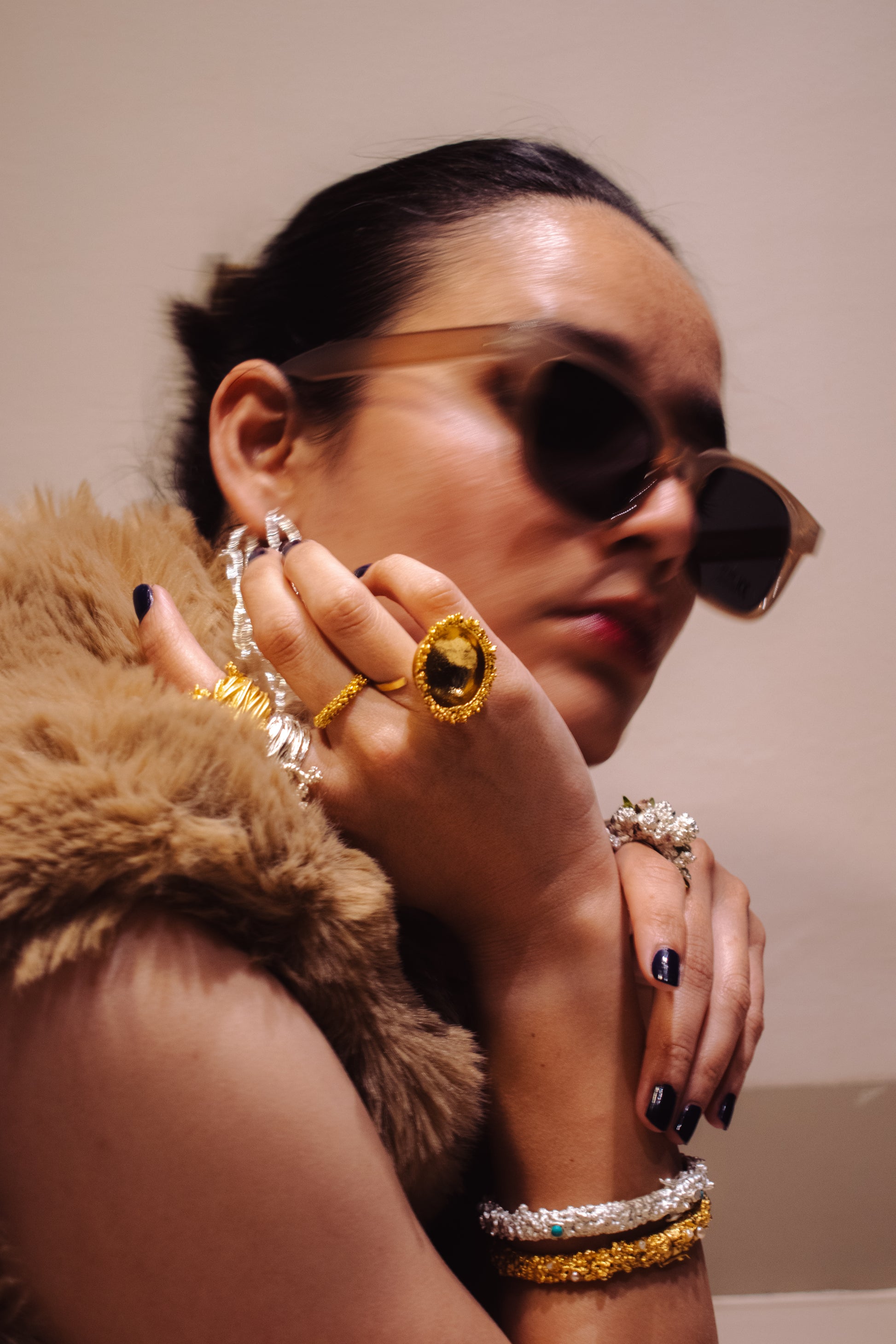Astral ornament traverses the far reaches – from the depths of the ocean floor to the peaks of outer space, bringing back luscious textures and enticing mysteries of worlds unknown. Bubbly granulation textures arising from Surabhi’s experimental metal craft, adorn the rims of reef like cups and craters, giving the collection an ethereal appeal.