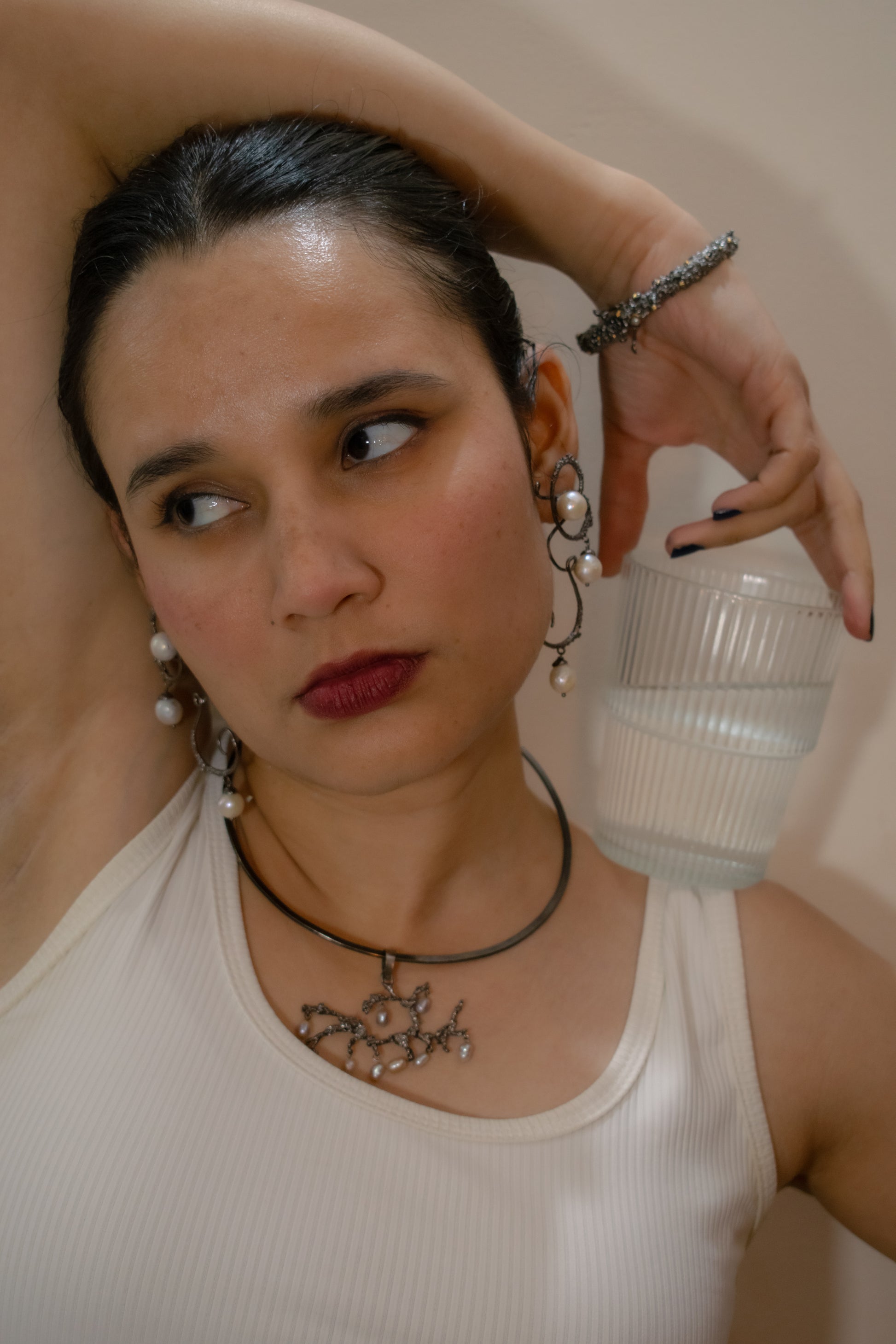 Astral ornament traverses the far reaches – from the depths of the ocean floor to the peaks of outer space, bringing back luscious textures and enticing mysteries of worlds unknown. Bubbly granulation textures arising from Surabhi’s experimental metal craft, adorn the rims of reef like cups and craters, giving the collection an ethereal appeal.