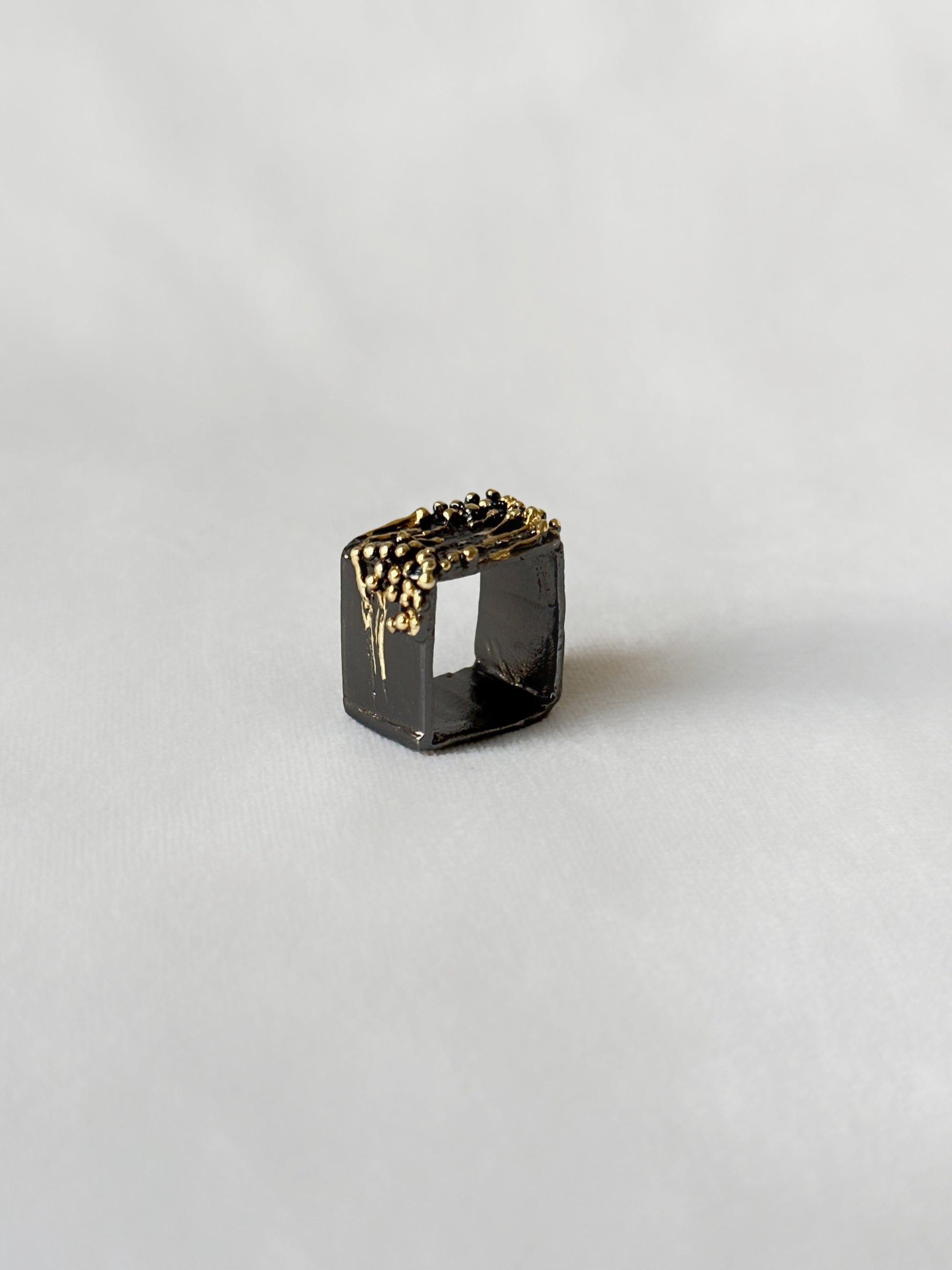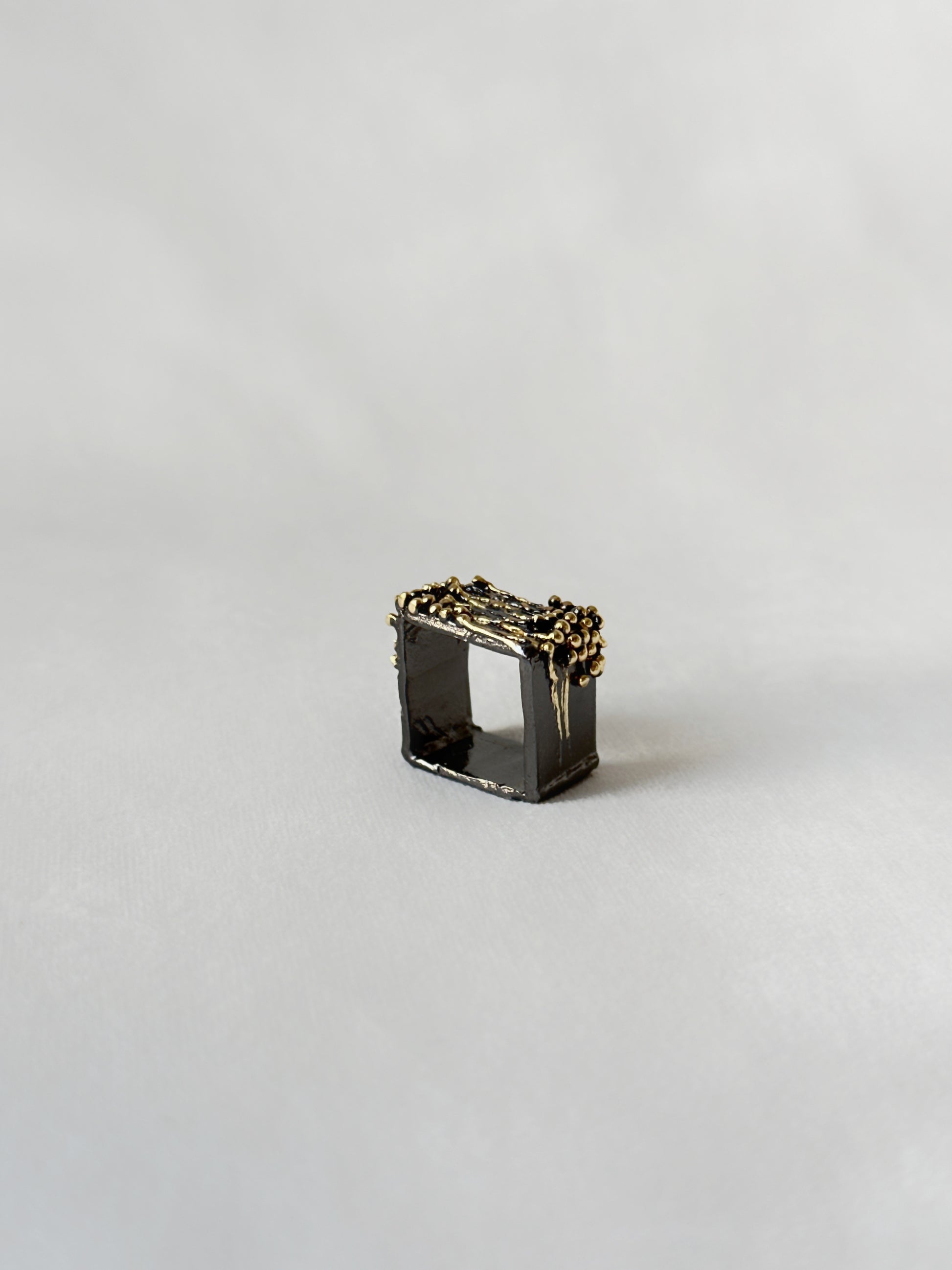 With Manthan, I explore treasures from the sea through material explorations in copper. The square ring is an imagined excerpt from the underwater world, rendered in black and gold.