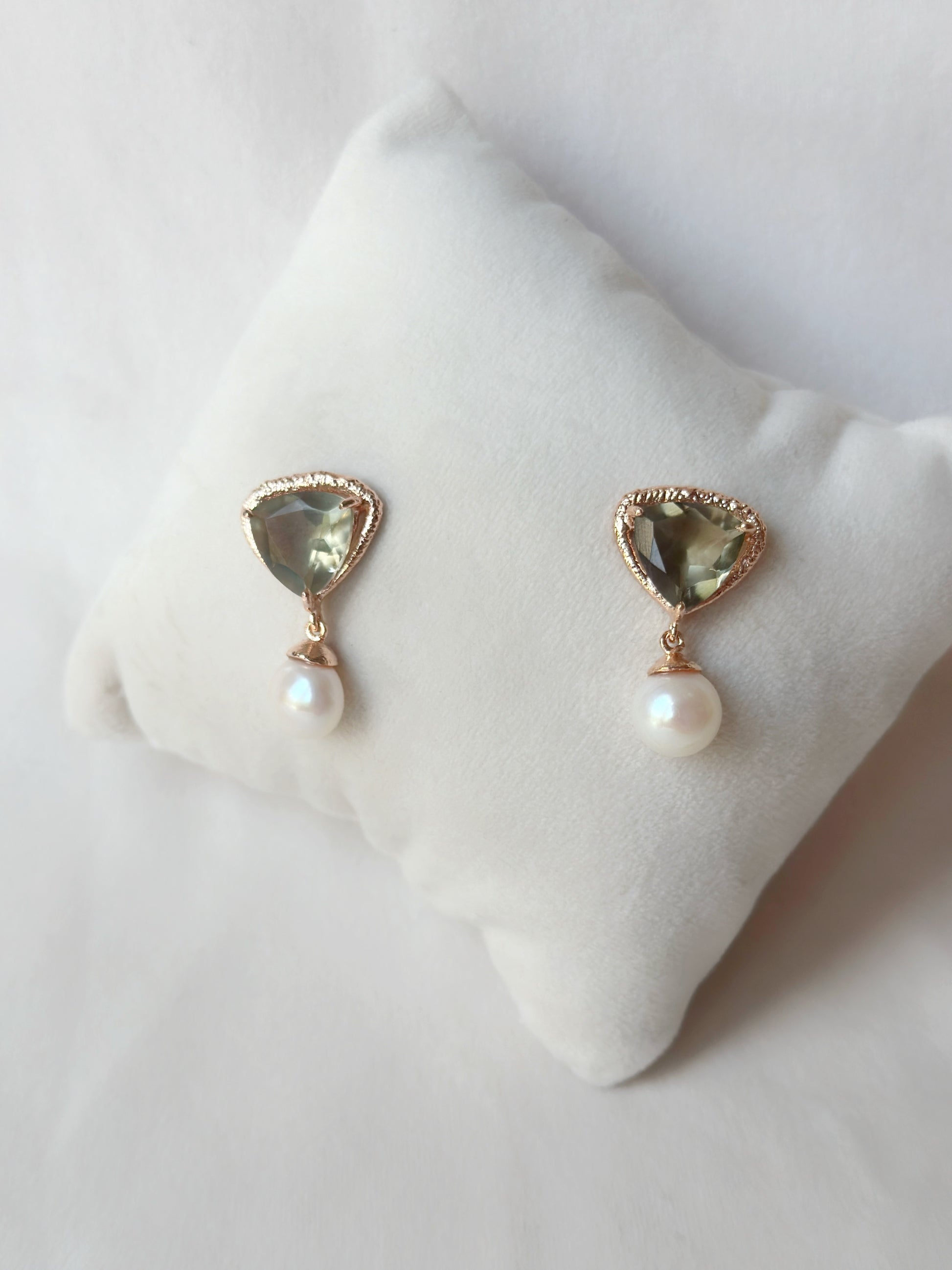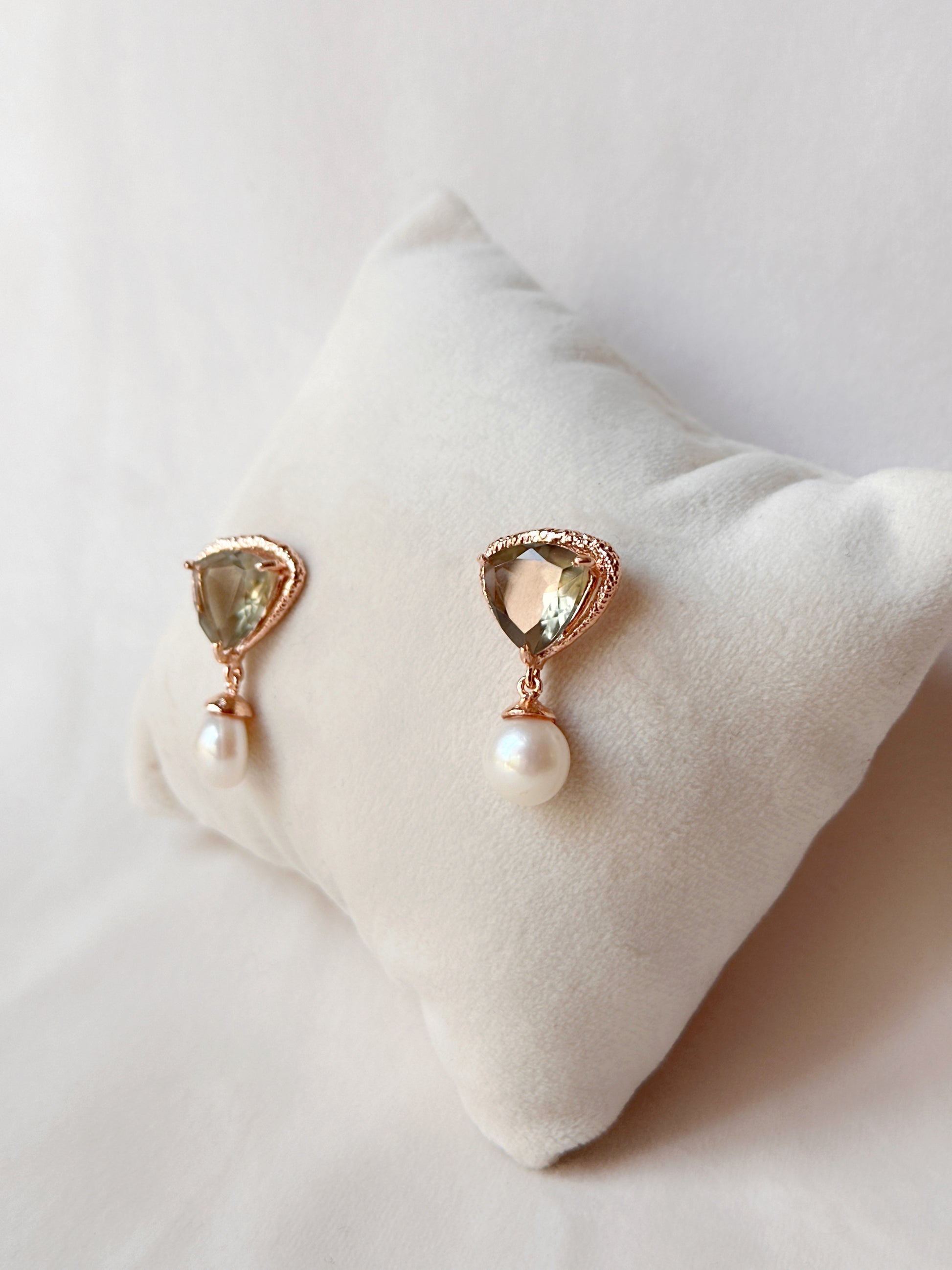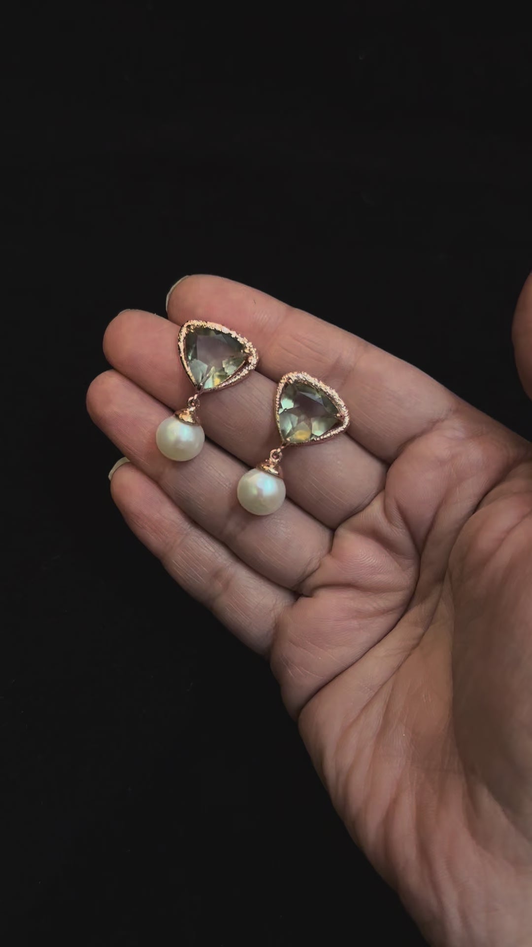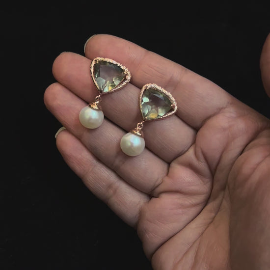 Delicate and contemporary, these trillion cut green amethyst and pearl drop earrings are conversation pieces. Finished in warm rose, from the collection Sprigs 'n' Stones.