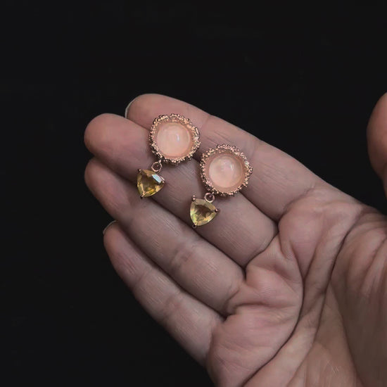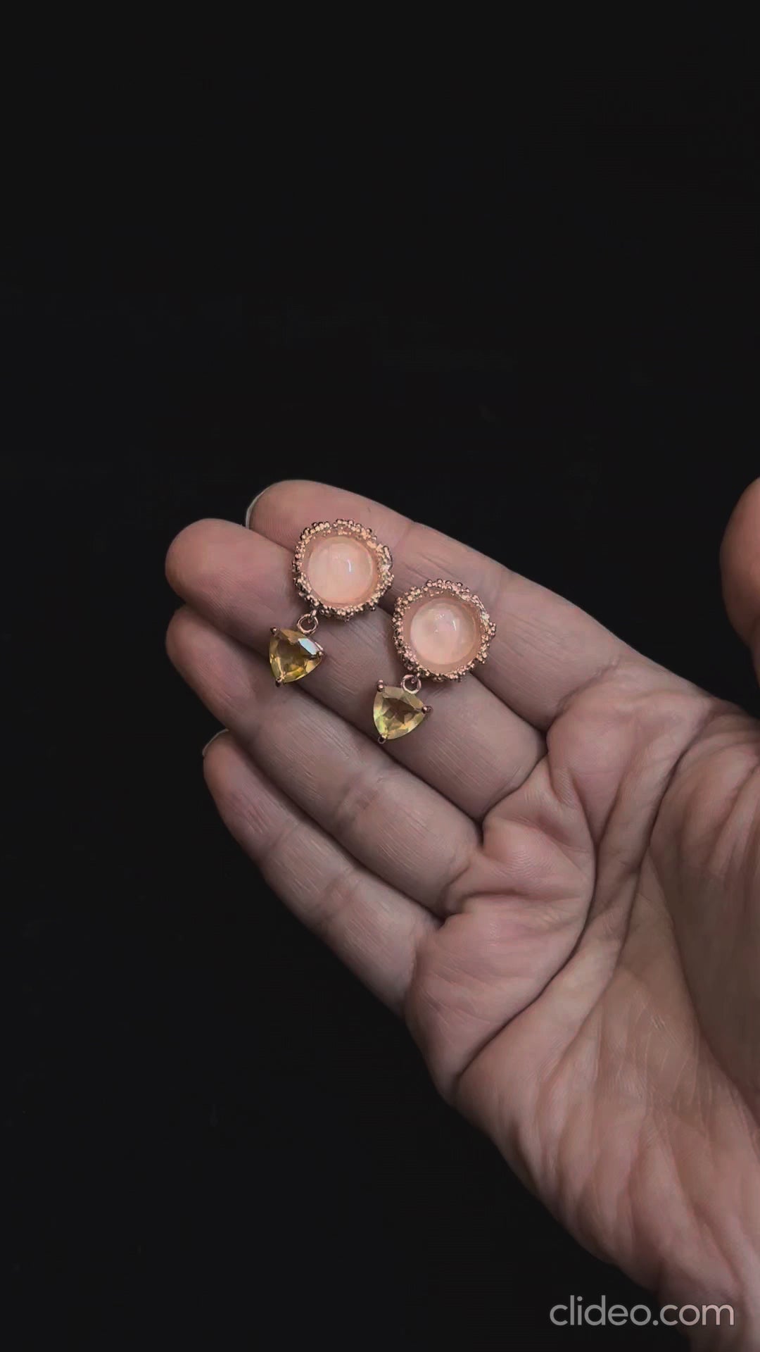 Rose gold plated brass, rose quartz, citrine. All Figmenterie jewellery is coated with Hypoallergenic lacquer coatings to protect your skin as well as plating finishes.