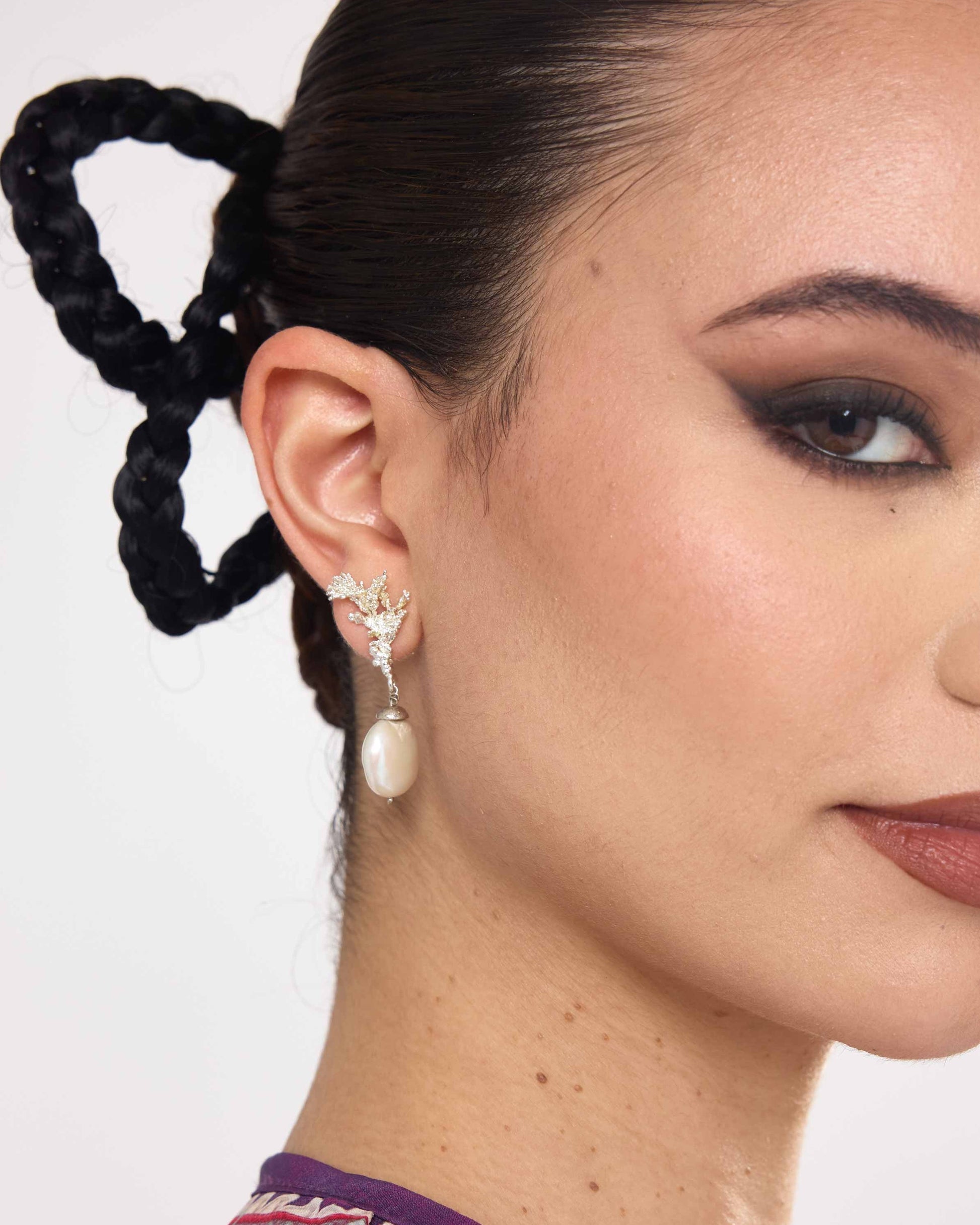 Delicate and contemporary, these coralline earrings with trailing baroque pearl drops are conversation pieces. Finished in meteorite black, from the collection Sprigs 'n' Stones.